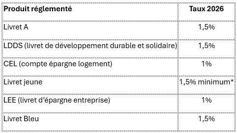 • Livret A : taux abaissé à 1,5% à compter du 1er février 2026 (après 2,4% puis 1,7% pour l’année 2025).