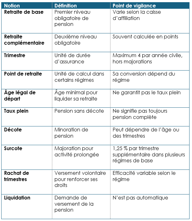 Cette distinction est déterminante en matière de lisibilité. Beaucoup d’assurés raisonnent uniquement en âge de départ, alors que la retraite doit être envisagée comme un ensemble : droits acquis dans les régimes obligatoires, niveau de pension attendu, éventuels rachats de trimestres, dispositifs de transition de fin de carrière, puis complément par l’épargne individuelle ou collective.